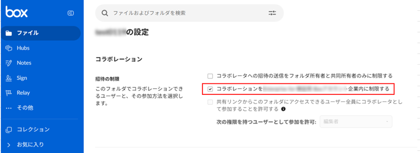 もし、フォルダ設定の該当項目がグレーアウトされ、設定を変更できない場合、該当フォルダの所有者に[コラボレーションを [自分の組織] 内に制限する]設定を無効に変更するよう、ご依頼ください。